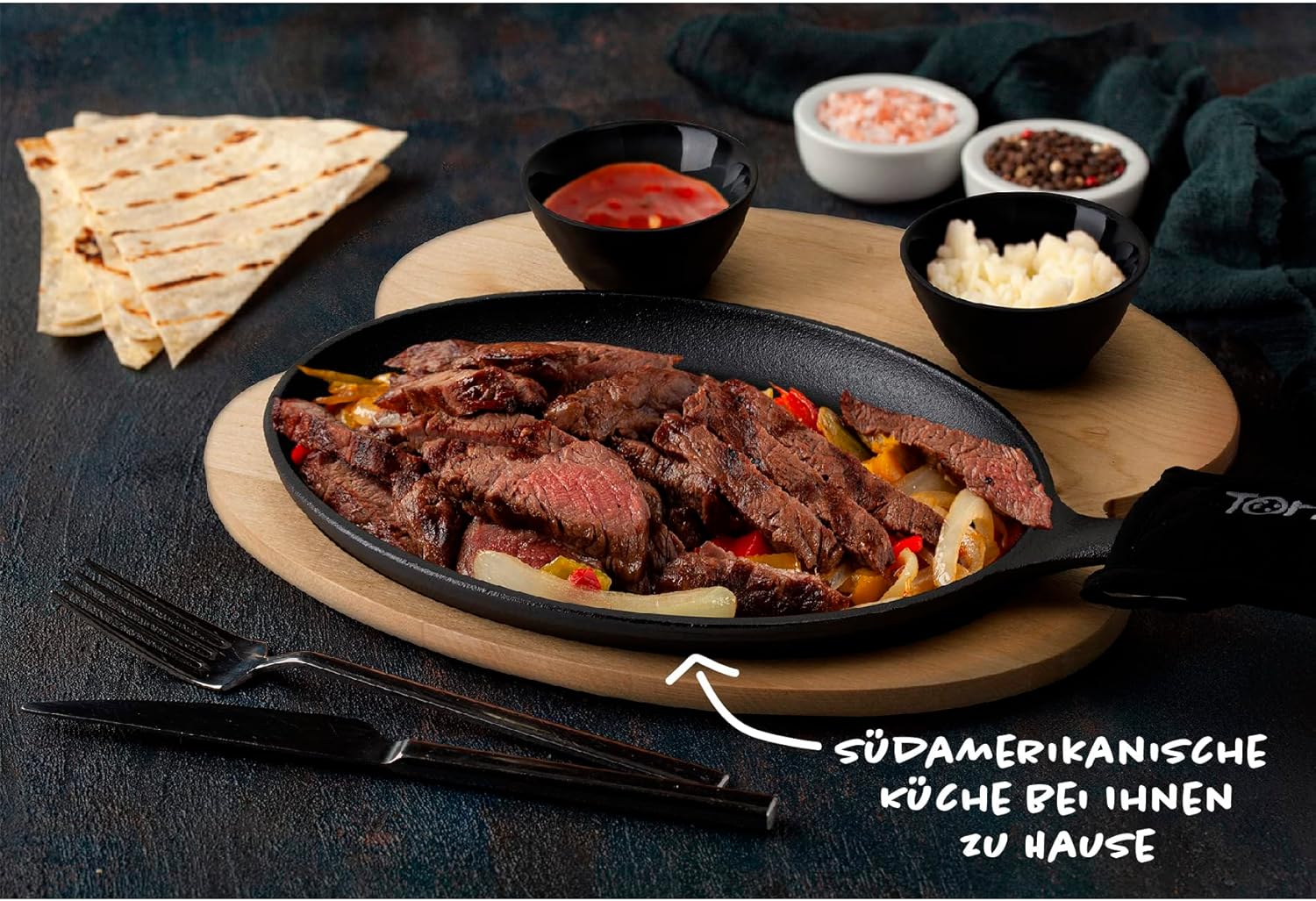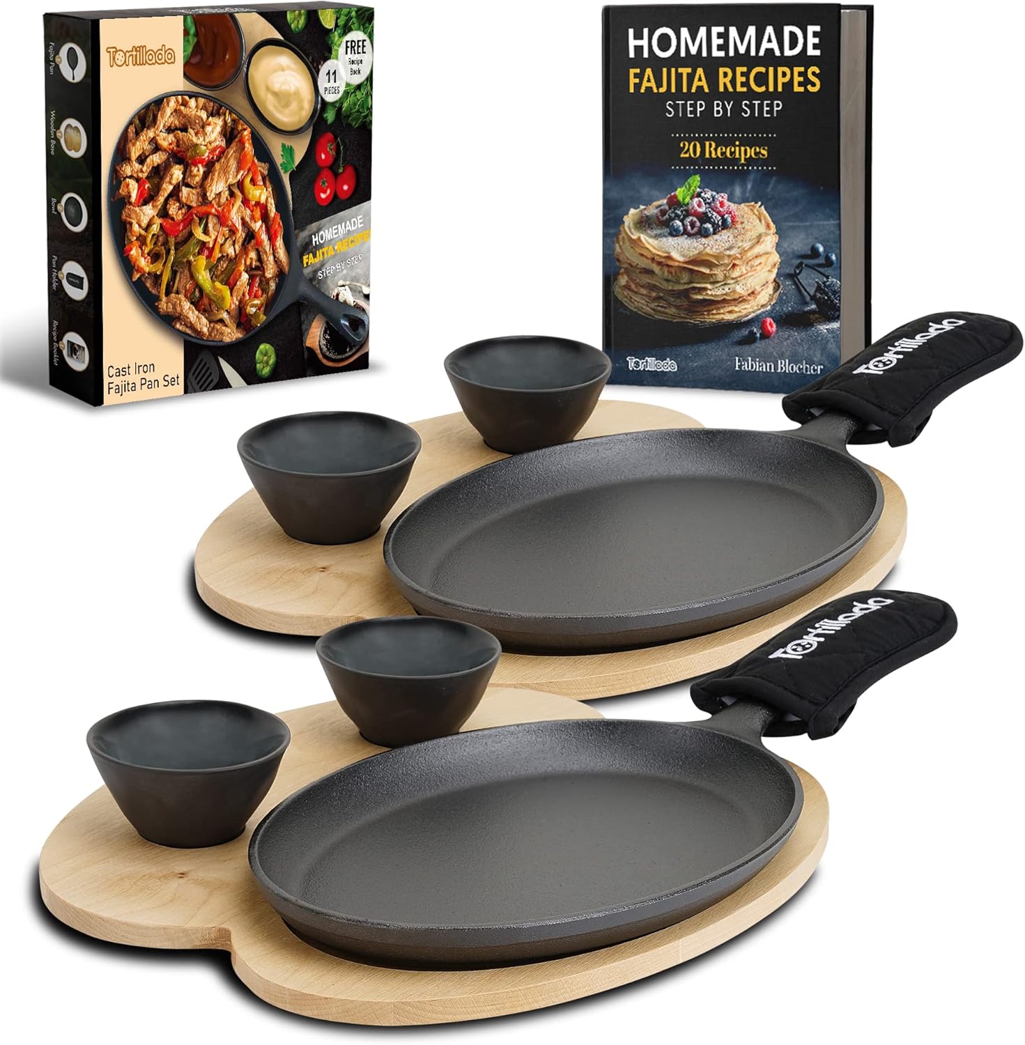 ā 10 Inch Cast Iron Fajita Pan/Grill Pan Set for Fajitas ā Incl. Wooden Serving Tray + 2 Ceramic Dip Bowls (Set of 2)
