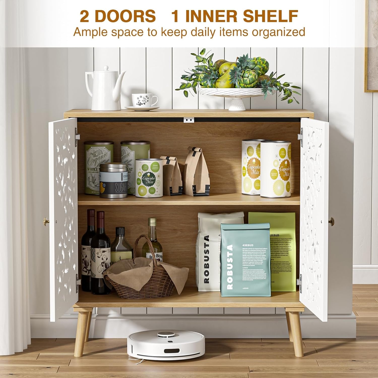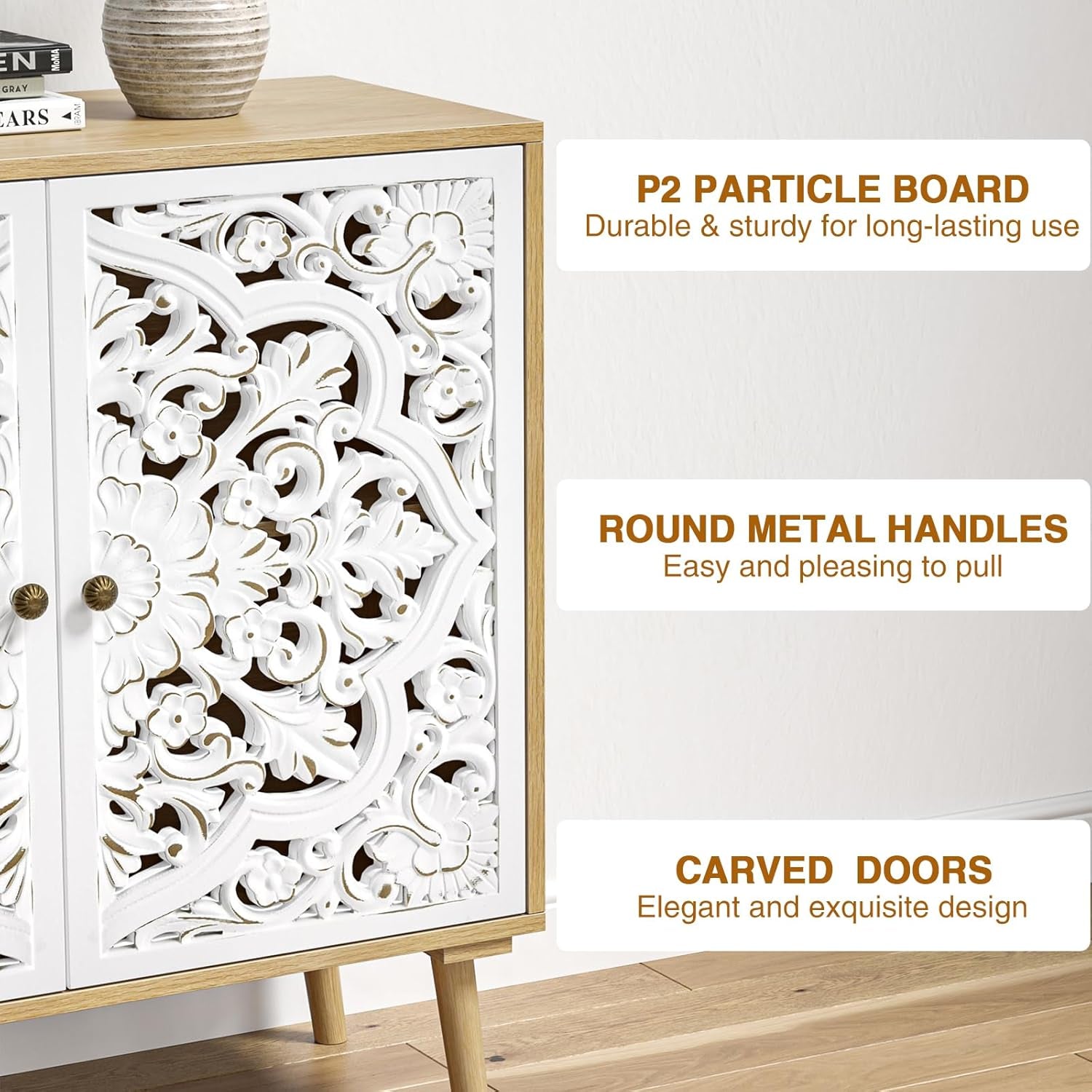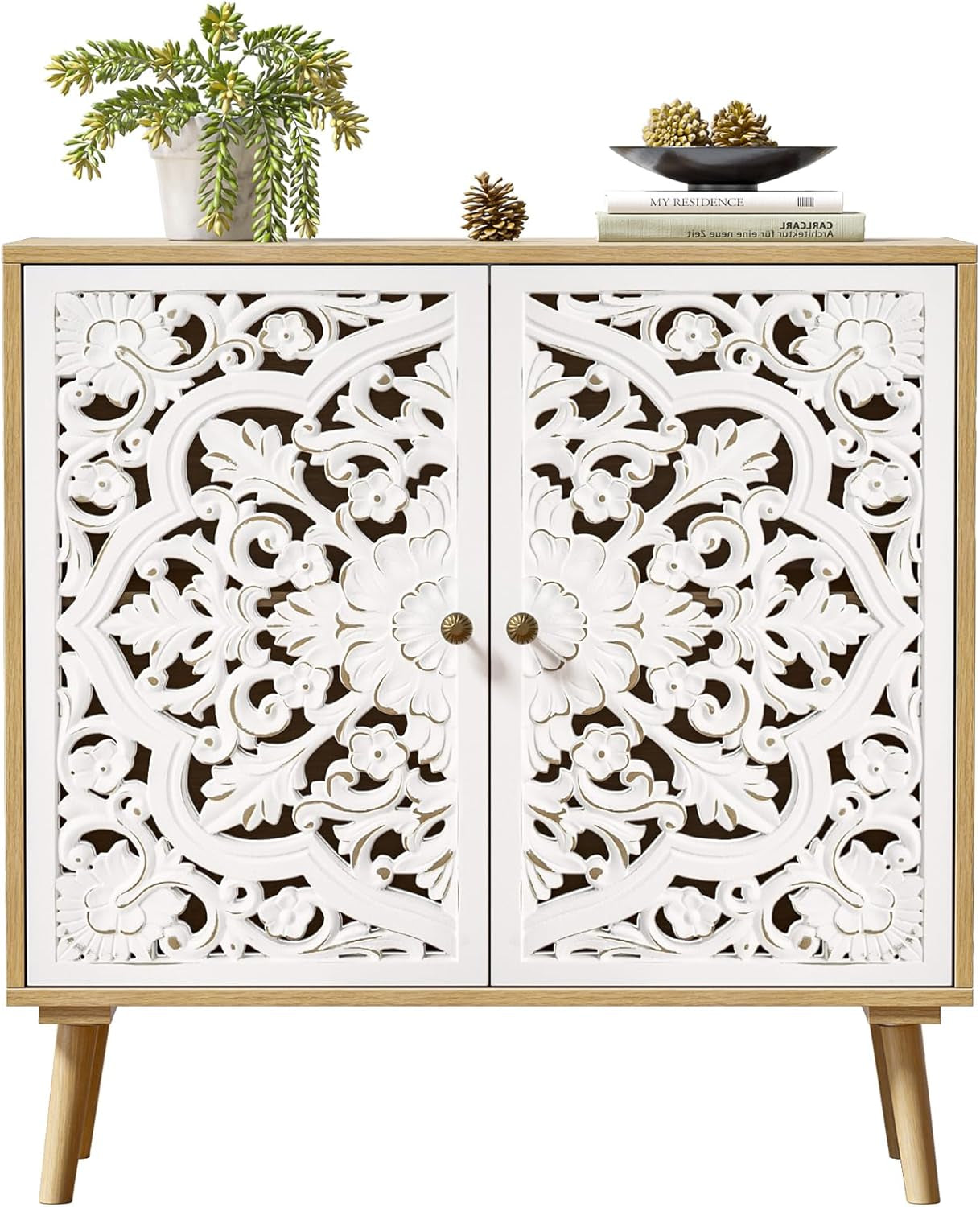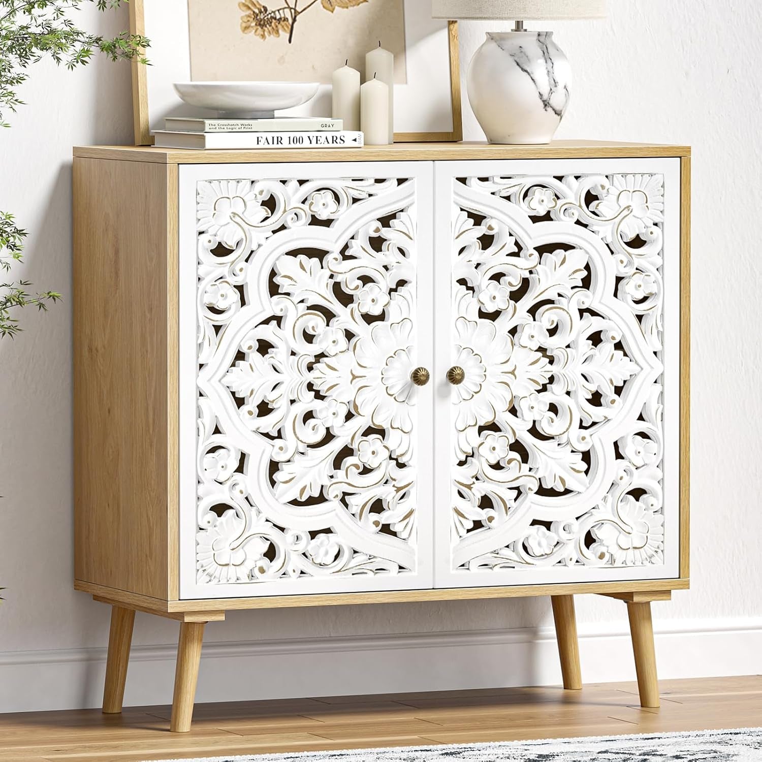 Accent Cabinet with 2 Doors, Carved Cabinet Decorative Sideboard Storage Cabinet with Adjustable Shelf, Entryway Cabinets for Kitchen with Storage Credenza