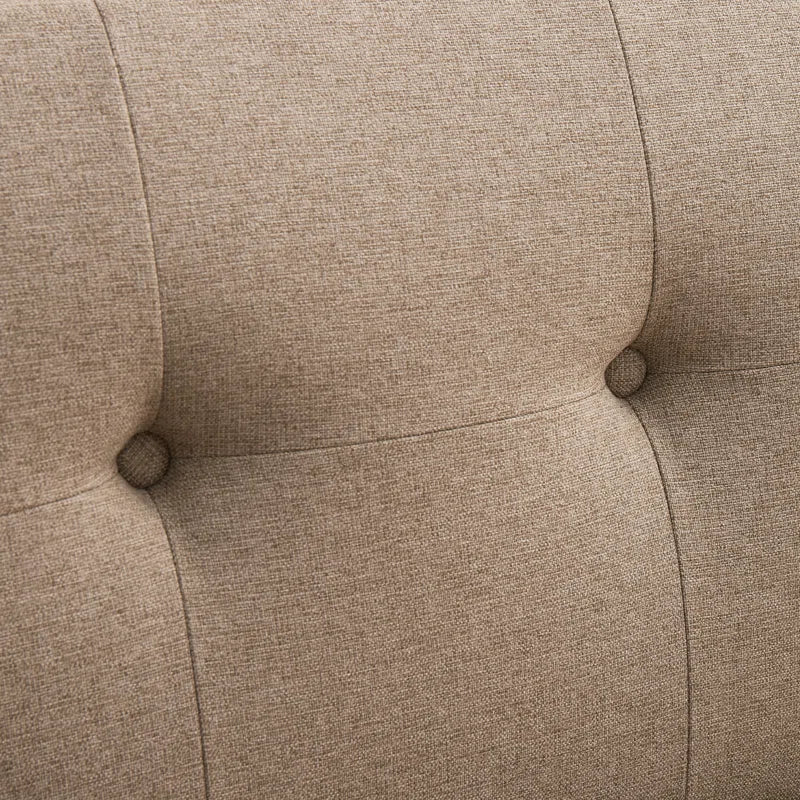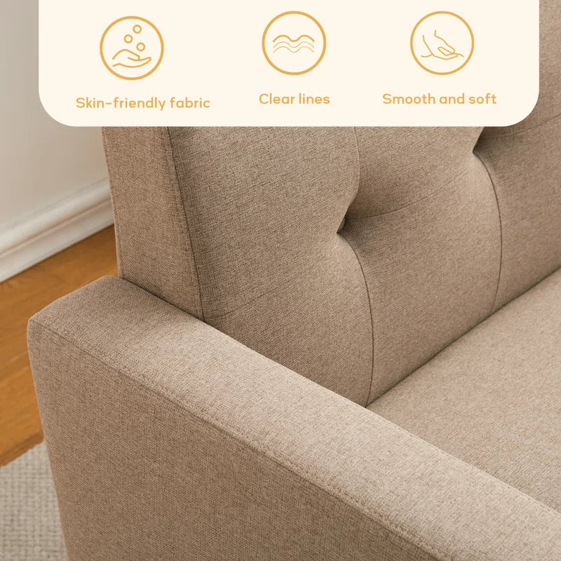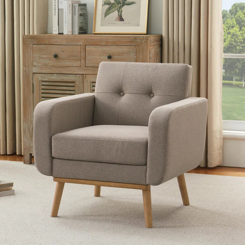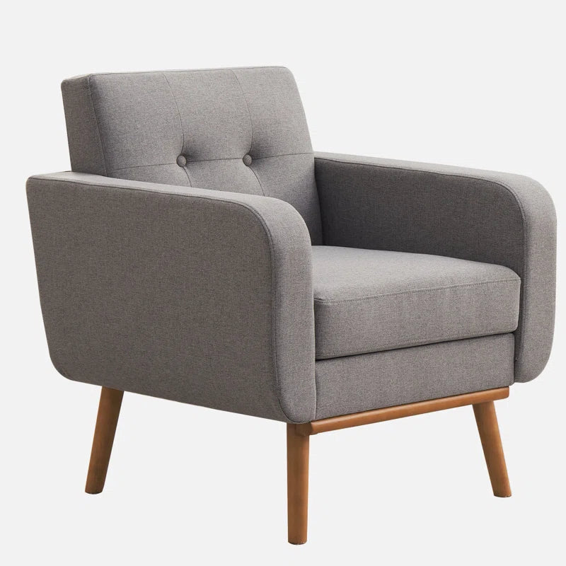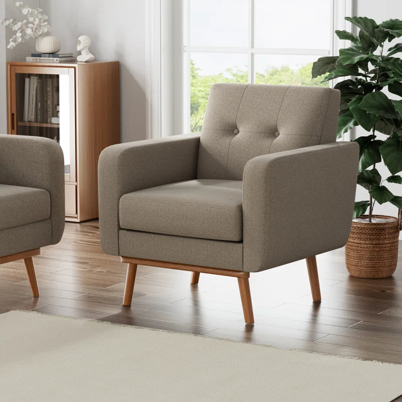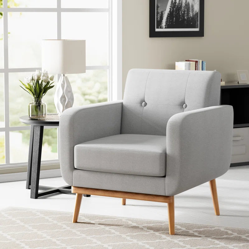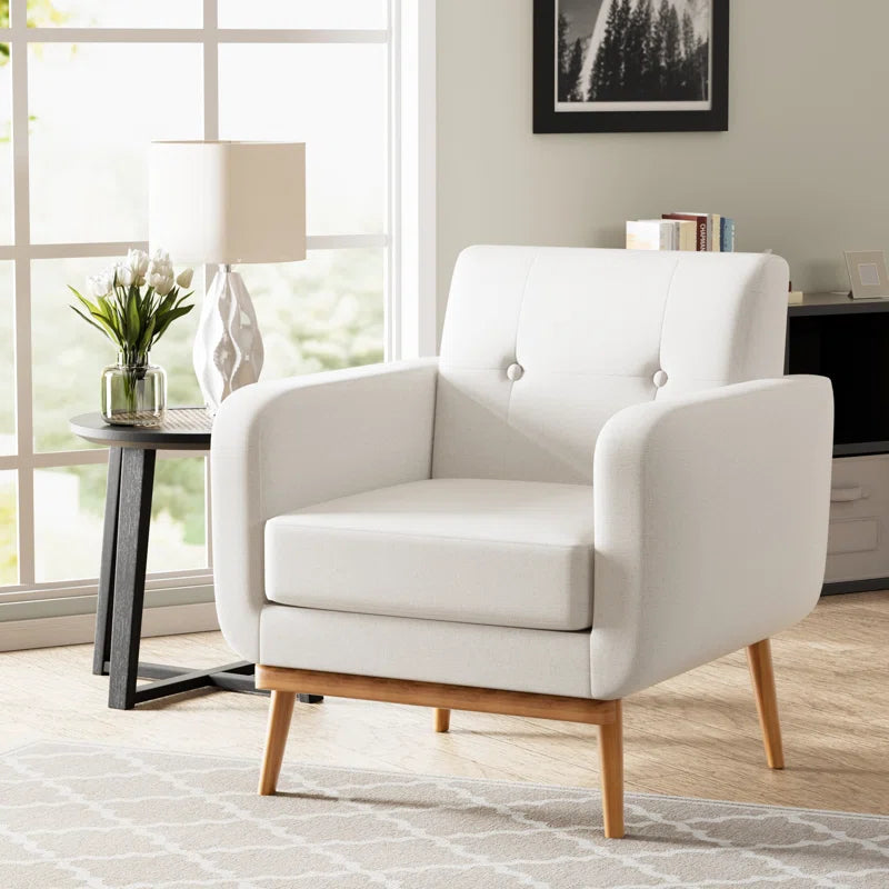 Full of mid-century modern style, this accent chair's square arm design and four splayed wooden legs bring a sleek, streamlined look to any room in your home. It has a solid wood frame that's wrapped in polyester in a hue and design of your choice to fit your aesthetic and colour palette. Subtle tufting on the back makes this armchair feel right at home in an office setting or your living room or den. The seat cushion is also removable for hassle-free upkeep. Use a spot treatment for easy cleaning. Supports up to 300 lbs.