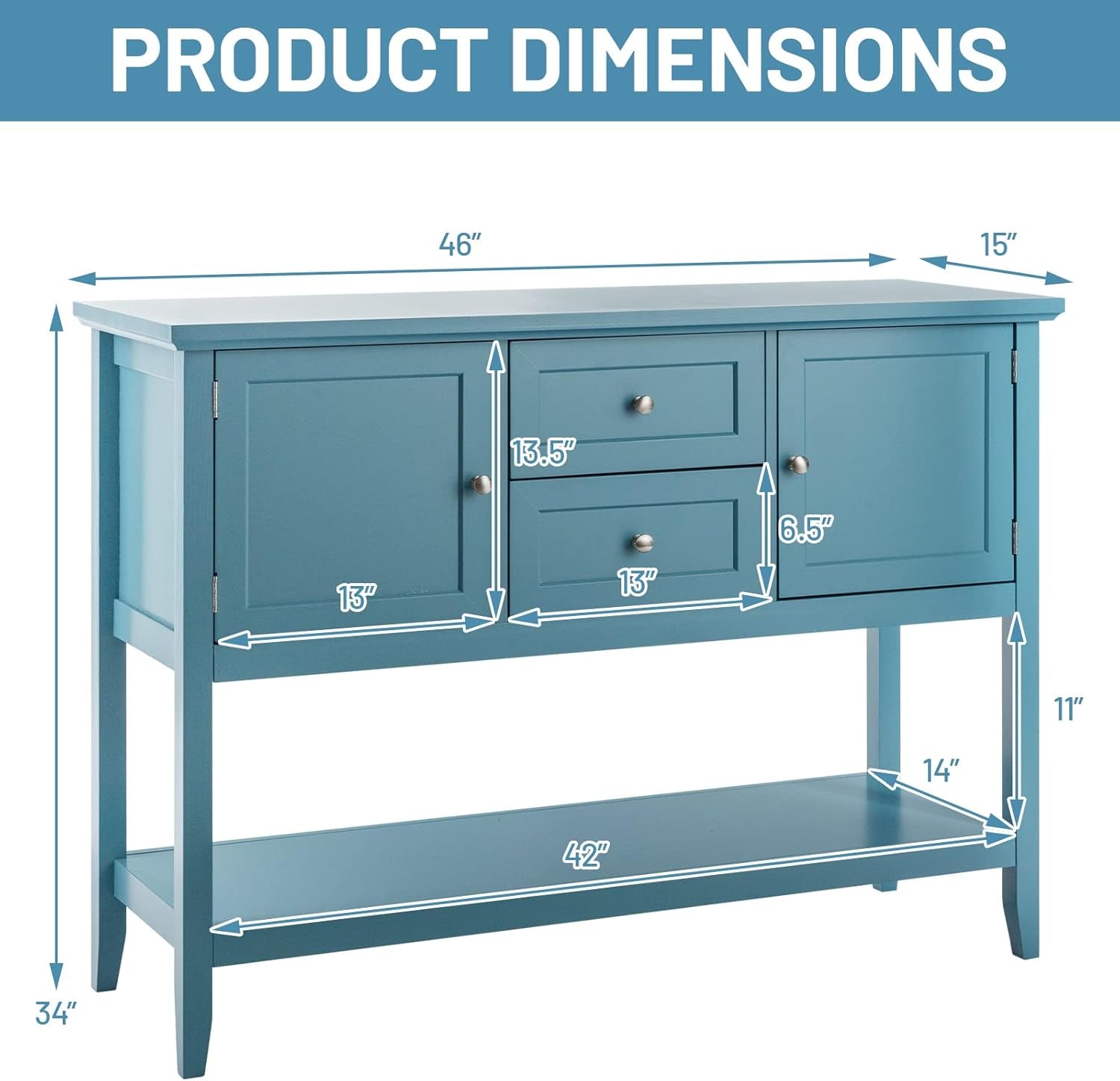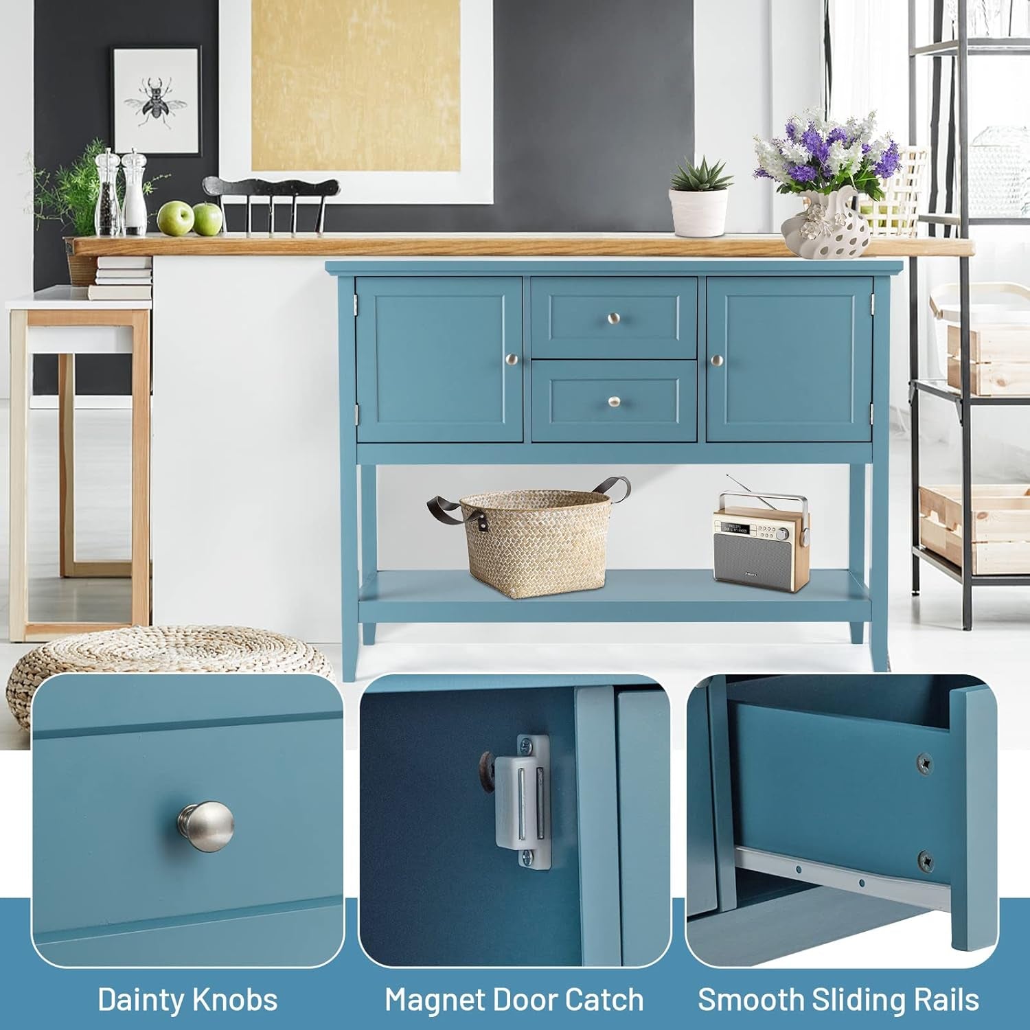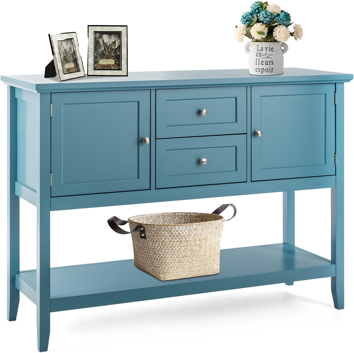 Buffet Sideboard, with 2 Wood Storage Drawers & Open Shelf, Console Table for Living Room Kitchen Dining Room Furniture (Blue)