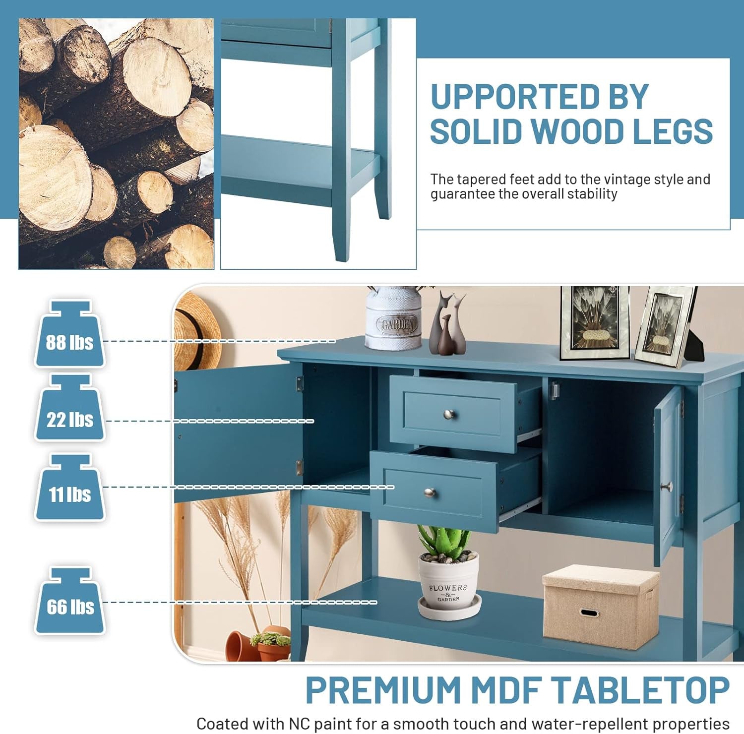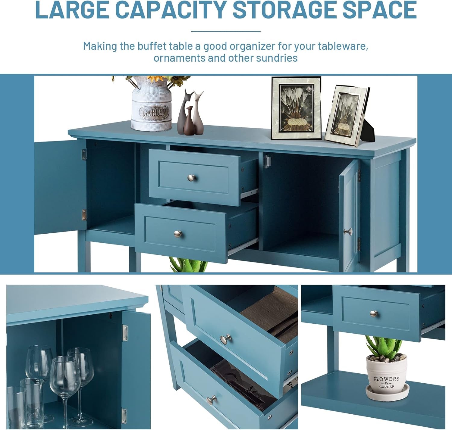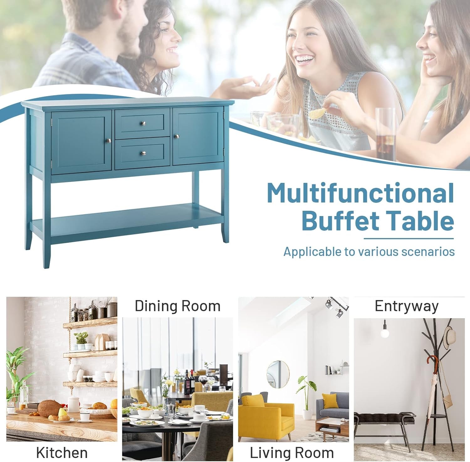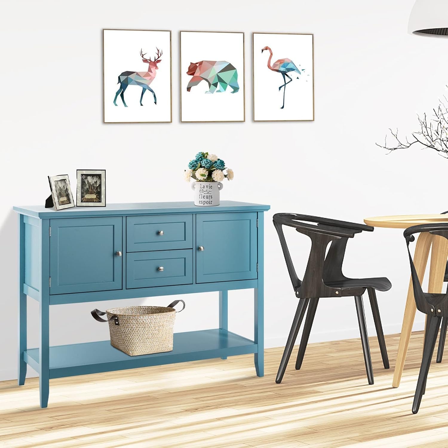 Buffet Sideboard, with 2 Wood Storage Drawers & Open Shelf, Console Table for Living Room Kitchen Dining Room Furniture (Blue)