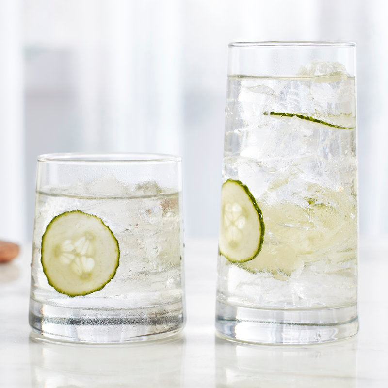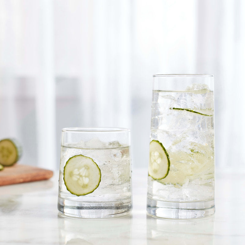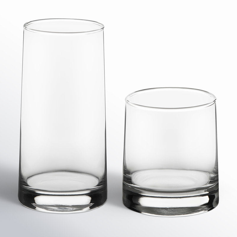 Libbey Cabos 16 Piece Tumbler and Rocks Glass Set: Elevate your drinkware collection with the our sleek and stylish rocks and glass tumbler set for hosting or everyday use. This versatile everyday drinking glasses set includes 8 tumbler glasses, each holding 15.8 ounces, and 8 double old fashioned whiskey glasses with a 10.8-ounce capacity. Crafted from premium-quality glass, these modern drinking glasses feature an ergonomic, angled design for a comfortable grip. The sturdy, weighted base of our dinner glasses set adds stability, preventing accidental spills. This drinking glass set is ideal for showcasing a wide range of beverages, from cold drinks to cocktails. The sleek design of our mixed drink glasses complements any table setting, whether it's a casual dinner or an elegant gathering. This set of glass cups is durable and dishwasher safe. These sturdy drinking glasses retain their shine and charm after each wash, ensuring these beverage glasses remain a cherished part of your glassware collection for years to come. This kitchen glasses set adds a touch of sophistication to your glassware collection and is the perfect choice for daily use or special occasions.