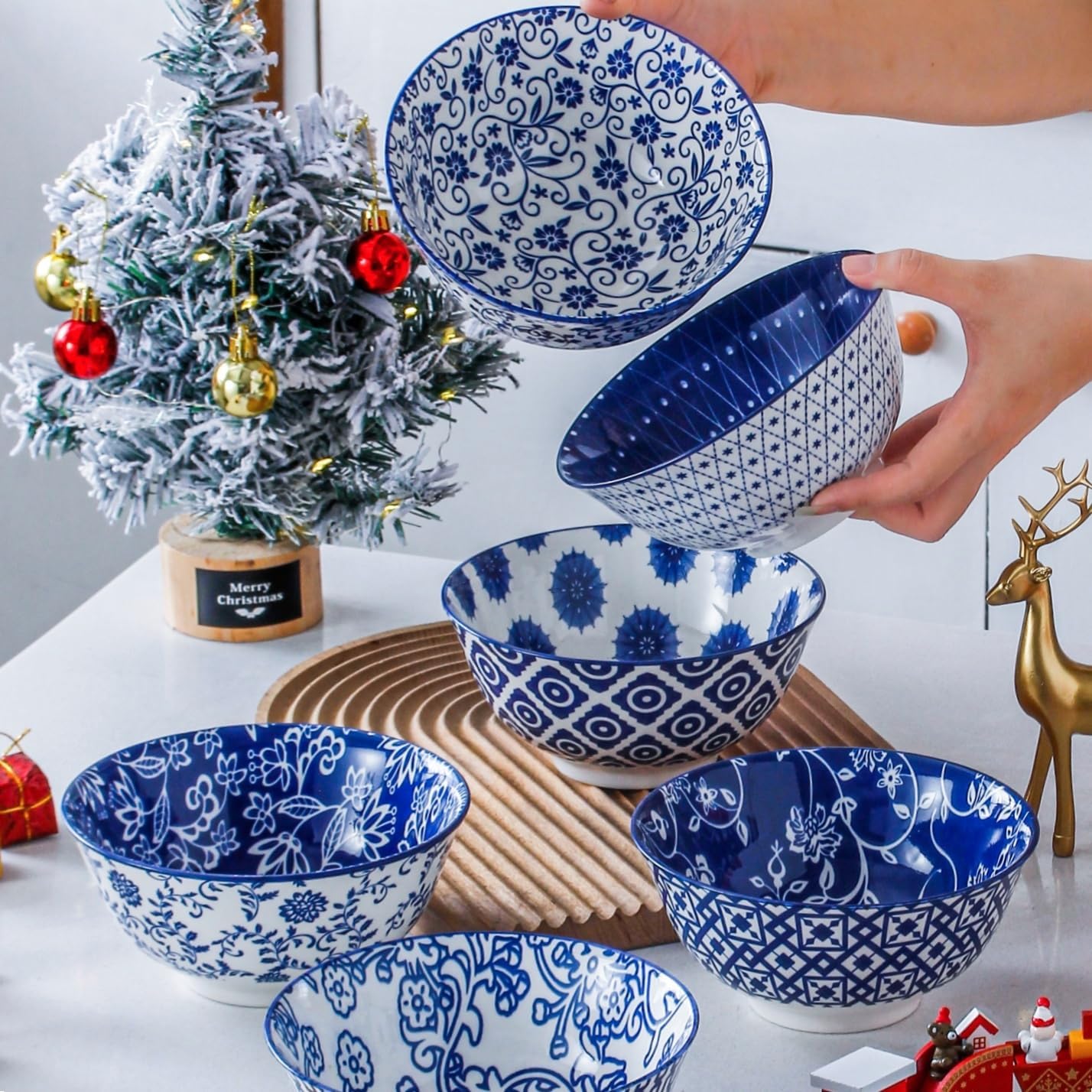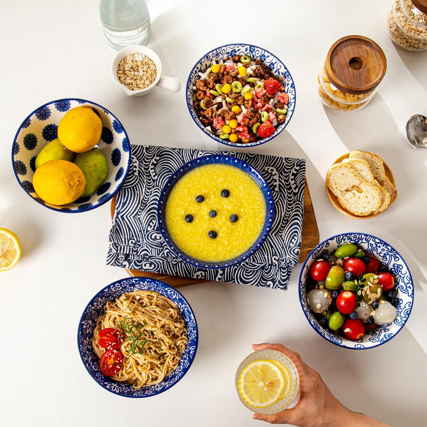 Ceramic Soup Bowls Set - 24 Oz Deep Cereal Bowl - 6 Inch Large Porcelain Dinner Bowl Eating Salad Pasta Dessert Oatmeal - Microwave Dishwasher Safe - Set of 6 - Vintage Blue