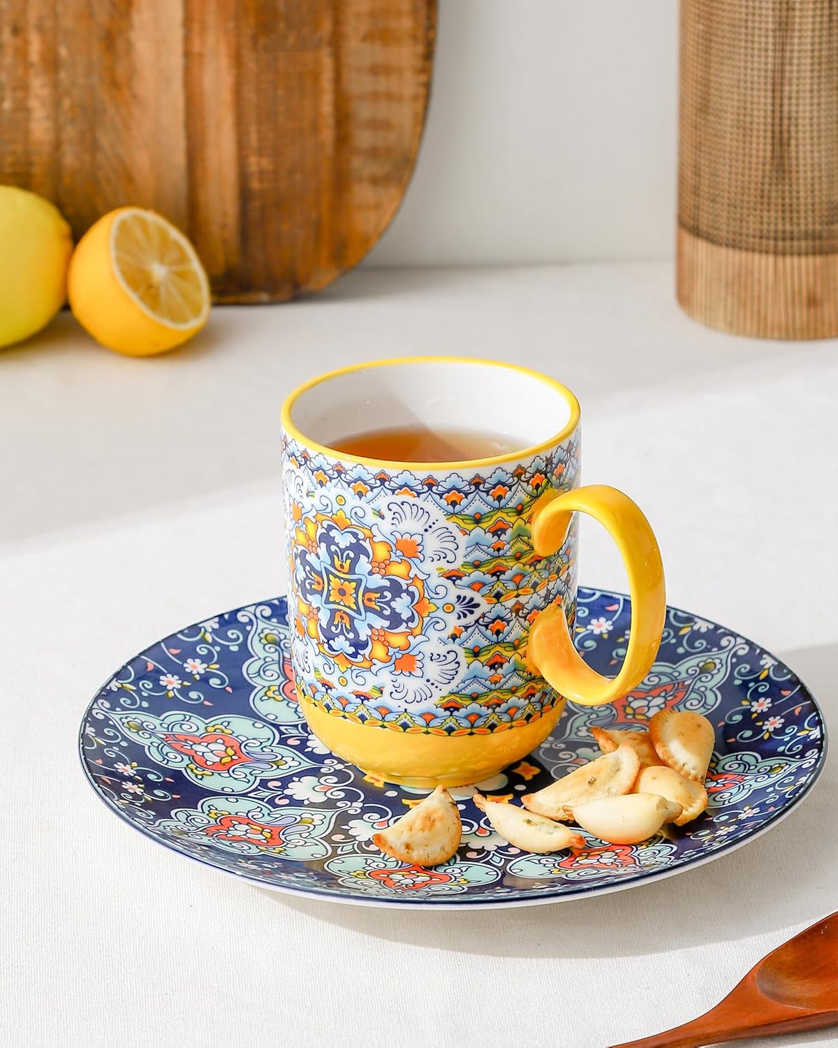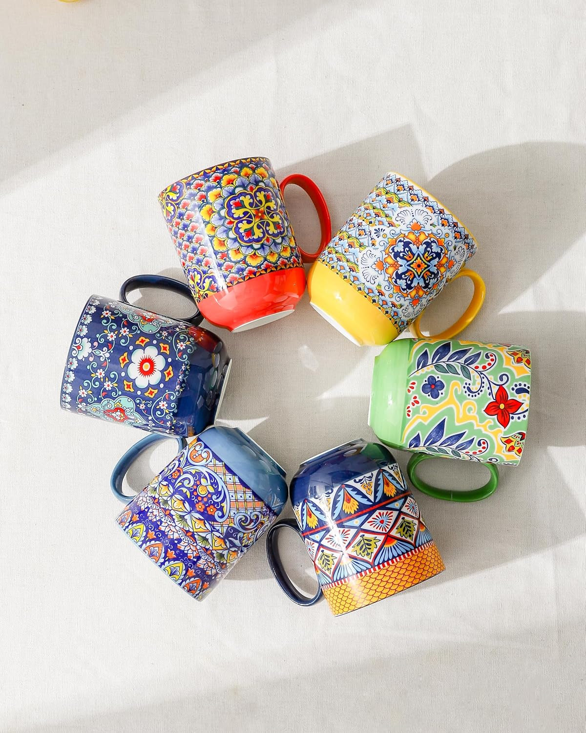 Coffee Mugs Set 14 Ounce - Multicolor Porcelain Cups for Latte, Hot Tea, Cappuccino, Cocoa, Soup, Dishwasher, Microwave Safe, Christmas Gift Set of 6 - Bohemian Style