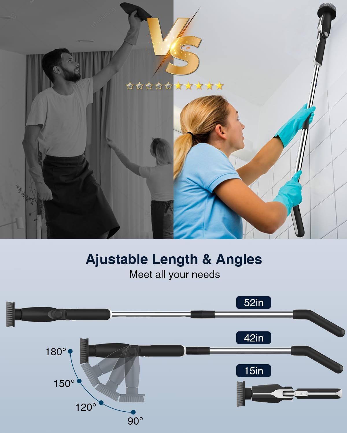 Electric Spin Scrubber, Shower Scrubber with 4 Adjustable Angles and 8 Brush Heads, Electric Scrubber with Long Handle & Remote Controller, Cleaning Brush for Bathroom, Tub, Floor (Black)