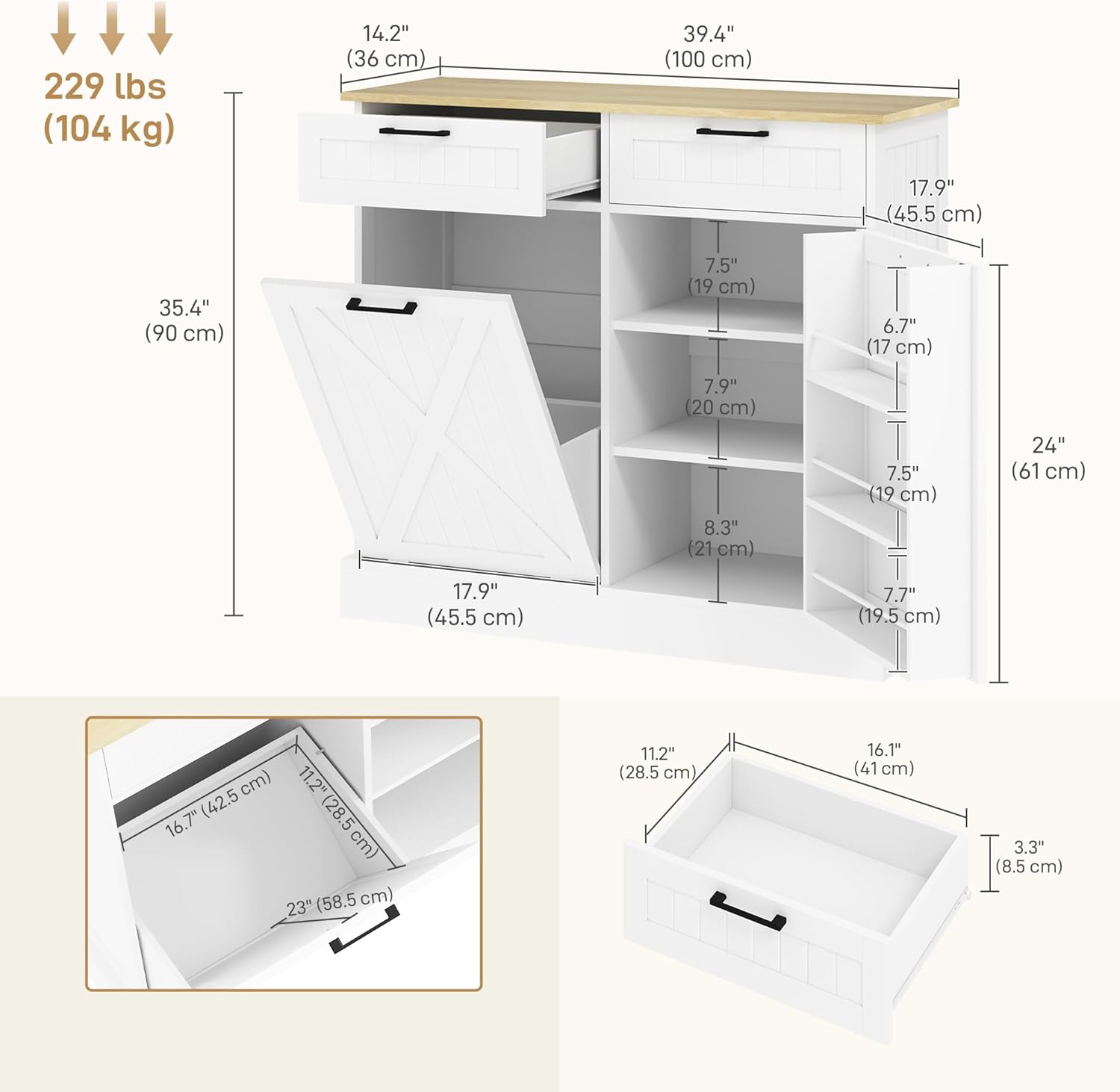 Farmhouse Tilt Out Garbage Cabinet, 10 Gallon Freestanding Kitchen Island with 2 Drawers and Spice Rack, Trash Cabinet with Storage for Dining Room, Hallway, White